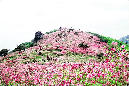 장흥과 보성 앞바다에 분홍 꽃그림자가 드리워지고 있다. 호남정맥(湖南整脈)의 주축을 이룬 제암산(帝岩山·807m)~사자산(獅子山·666m)~667.5m봉(삼비산)~일림산(日林山·626.8m) 산등성이가 철쭉꽃으로 빛나면서 산 아래 남해바다까지 붉게 물들이고 있다.