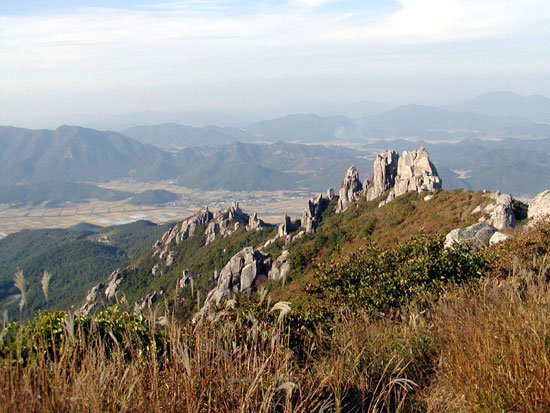 장흥에는 산이 많다. 그 중에서도 천관산(723㎙)을 꼽을 수 있다. 제암산이 봄철 반짝 인기를 누리는 산이라면 천관산은 사시사철 사람들이 찾는산이다. 도립공원으로 장흥의 얼굴인 셈이다. 정상의 웅장한 기암괴석이압권이다. 산 아래에서 보면 마치 톱날을 보는 것 같다. 등산로가 쉽지도어렵지도 않고 변화 무쌍해 재미있다. 가을에는 억새로 유명하다. 정상부40만여평의 능선이 온통 억새밭으로 변한다. 지금 억새꽃은 없다. 대신 눈부신 신록이 바위 봉우리 사이로 반짝거린다.